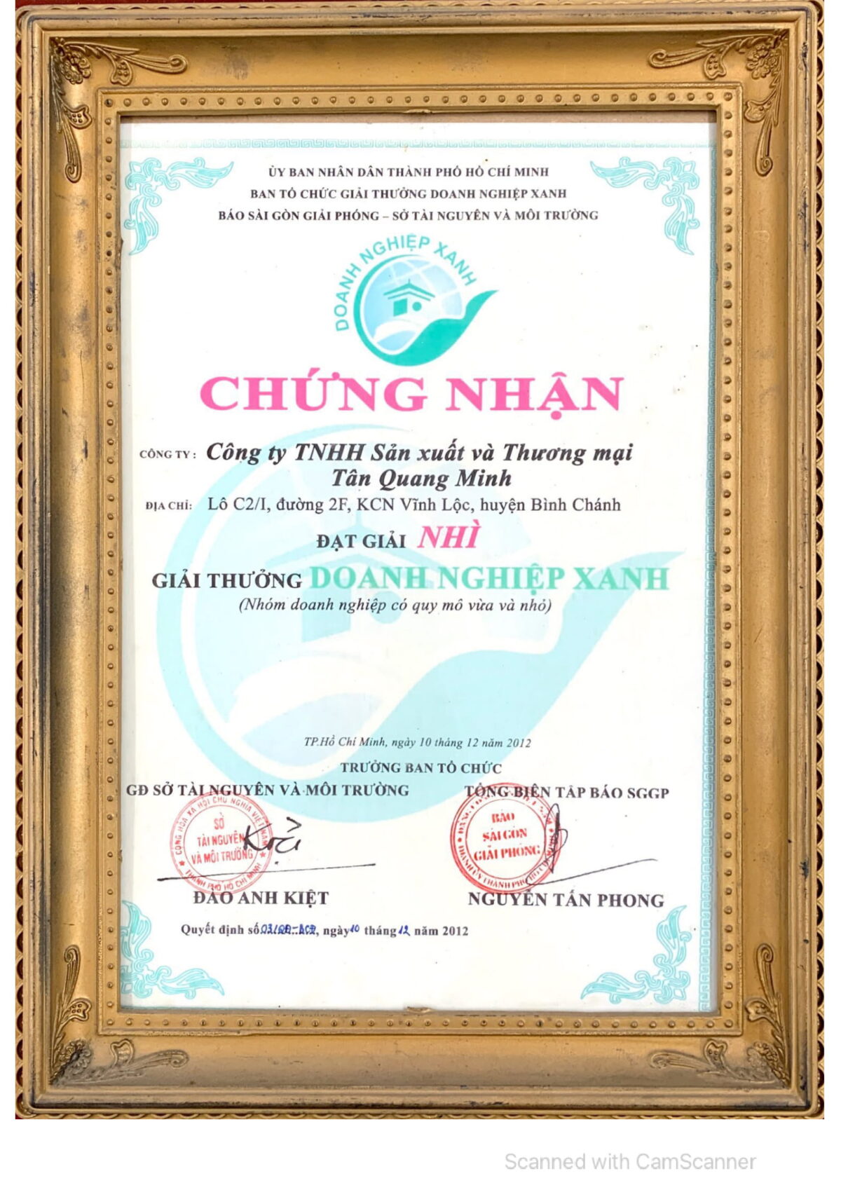 Sáng 14/12, tại Nhà hát TP.HCM, hội đồng điều hành Giải thưởng Doanh nghiệp xanh lần thứ III – 2012 đã trao danh hiệu Doanh nghiệp xanh cho 50 doanh nghiệp thuộc nhiều lĩnh vực, trong đó có Công ty TNHH Sản xuất và Thương Mại Tân Quang Minh (Bidrico) đạt giải nhì trong nhóm các DN có quy mô vừa và nhỏ.