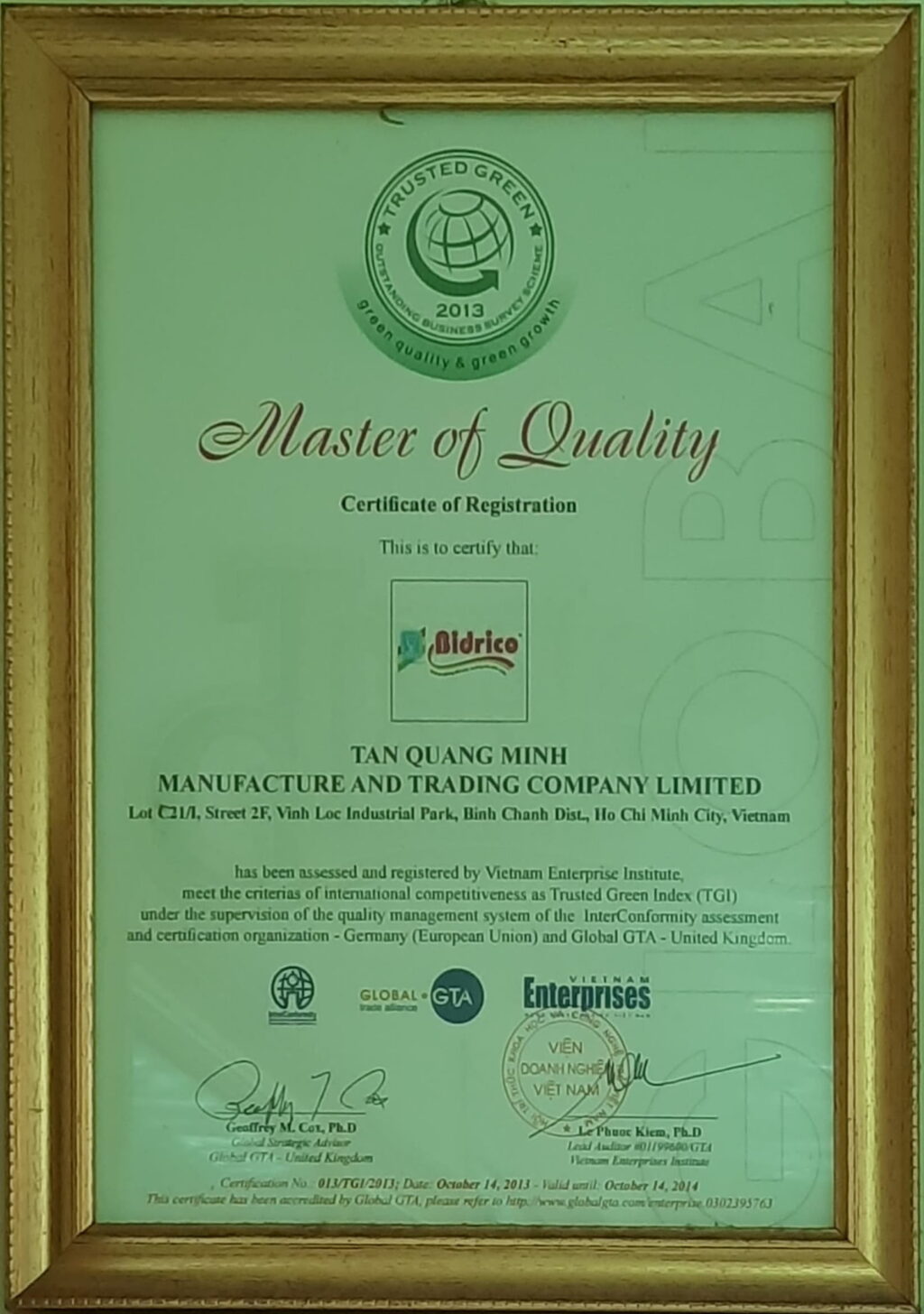 Tan Quang Minh Manufacture and Trading Co., Ltd. – Bidrico is honored to receive the “Trusted Green – Green Trust Index 2013” certification, quality-supervised by InterConformity (Federal Republic of Germany) and the National Quality Assurance (NQA) organization (United Kingdom), and jointly evaluated by the Vietnam Enterprise Institute. The “Trusted Green” certification is a precise measure...