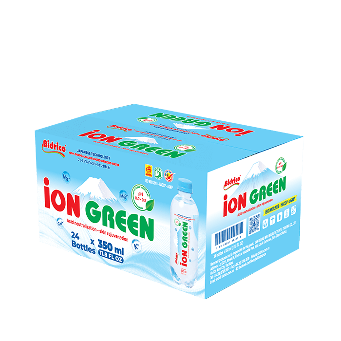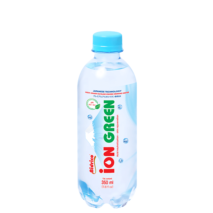 Nước uống ion kiềm cao cấp ION GREEN chai 350ml được tạo ra từ công nghệ điện giải, tách nước thành các ion H+ và OH-, có tính kiềm tự nhiên với độ pH khoảng từ 8.0 – 9.5. Sản phẩm được sản xuất trên dây chuyền tự động, khép kín, tích hợp công nghệ điện phân hiện đại từ Nhật Bản.